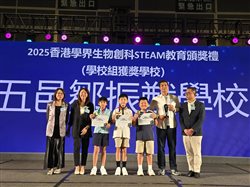 本校蔡嘉衡老師、5A 袁樂正、6A 楊建一及6D 鄭懿朗在「2025香港學界生物創科及steam教育精英大賽」分別獲得「香港傑出STEAM 教師大獎」及「香港傑出STEAM學生大獎」,可喜可賀。典禮完結後,學生在展覽中認識最新生物科技發展。