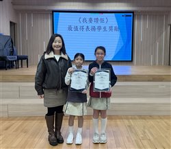 本校6A班冼樂晴同學及6C班孫樂澄同學於第二屆「香港優秀學生公益及社會服務獎」評選中表現突出,榮獲「嘉許獎(小學組)」。是次活動由香港文匯報與香港教育工作者聯會聯合舉辦,旨在表彰青少年的卓越貢獻及鼓勵社會服務,共有全港逾200所中小學及特殊學校學生踴躍參與。
