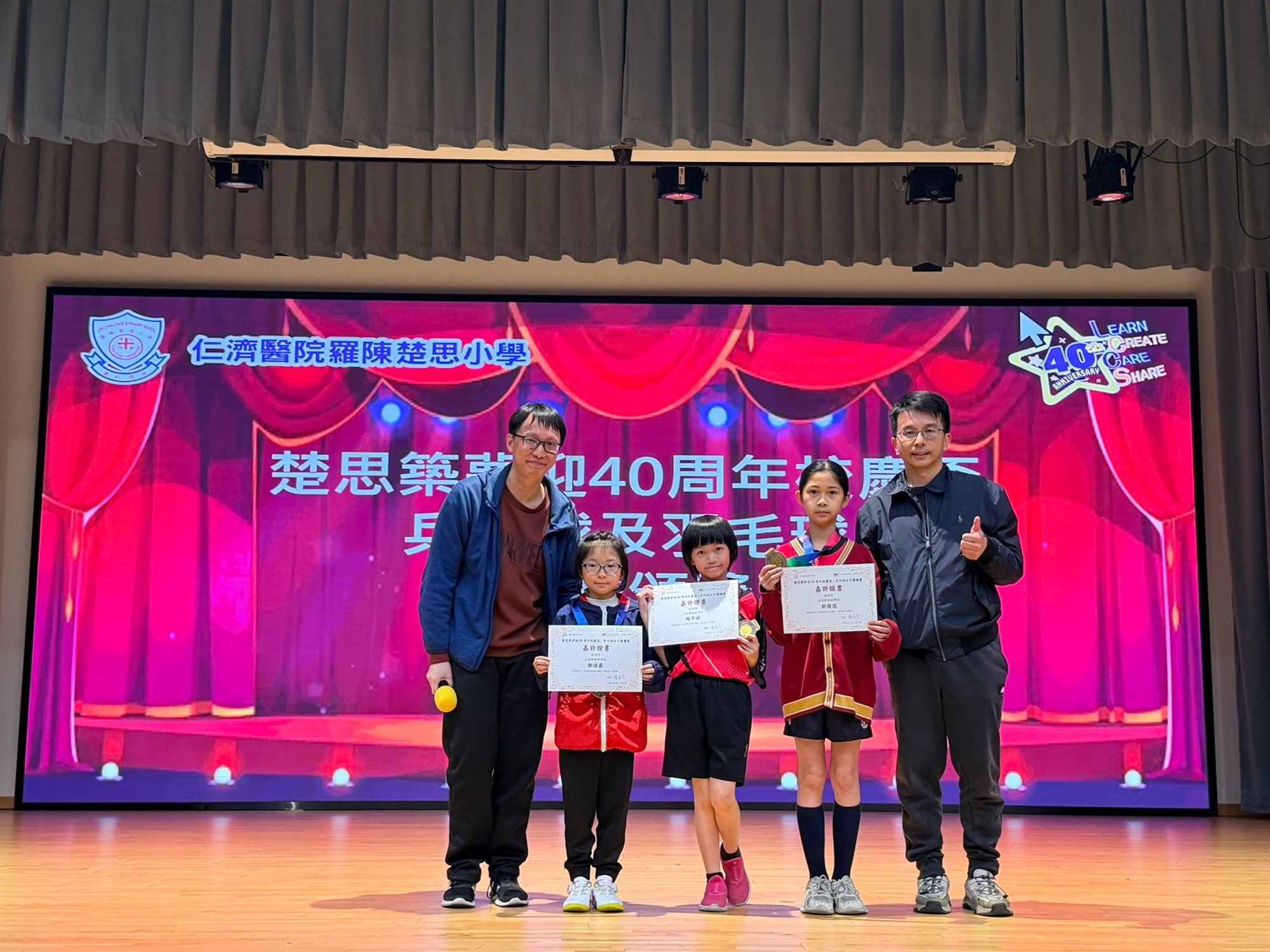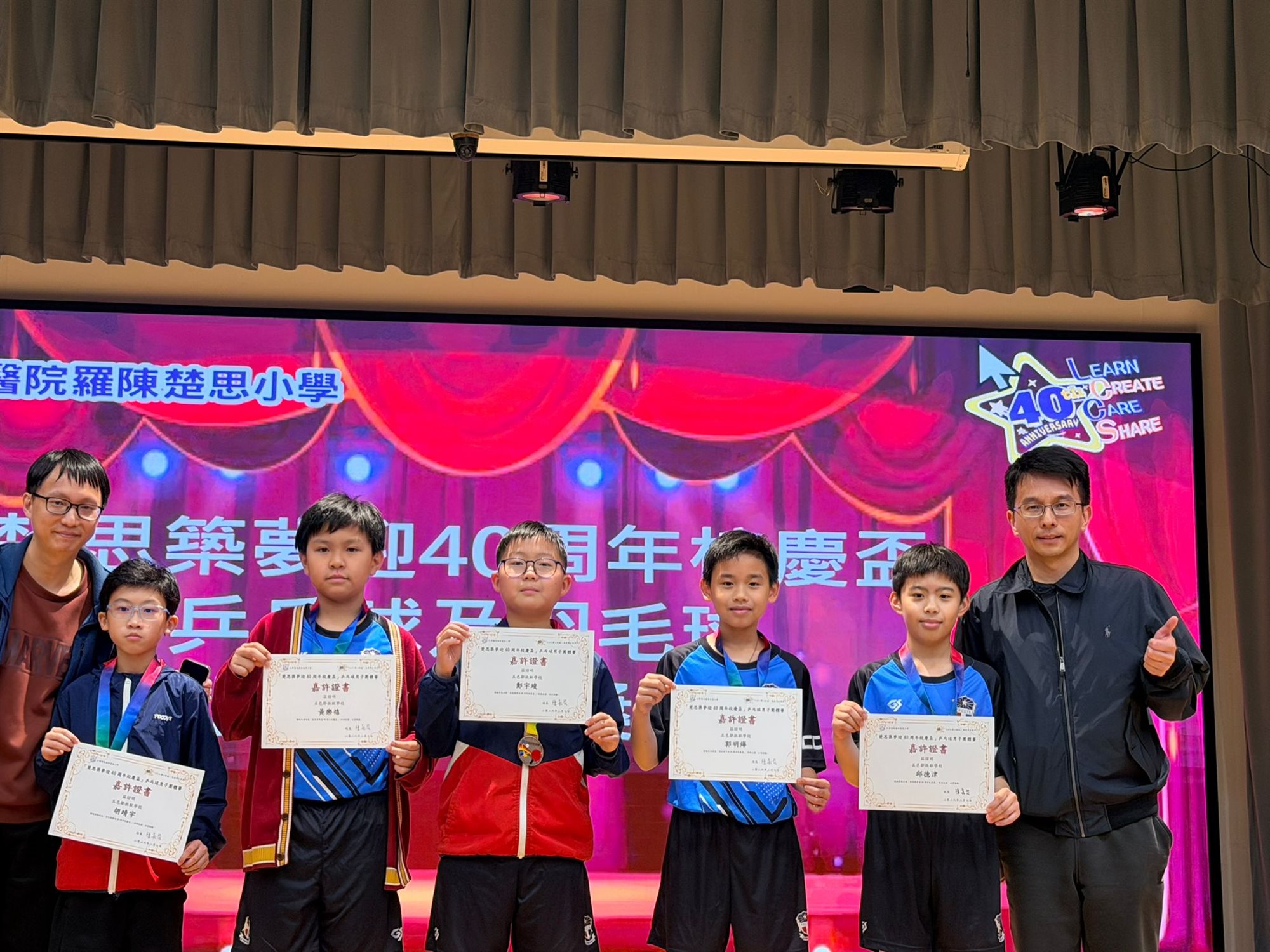 下午,5A邱德津、5C胡靖宇、6C鄭宇竣、6C郭明燁和6D黃樂禧在『仁濟醫院羅陳楚思小學40周年校慶盃乒乓球邀請賽』中獲得男子團體賽季軍。